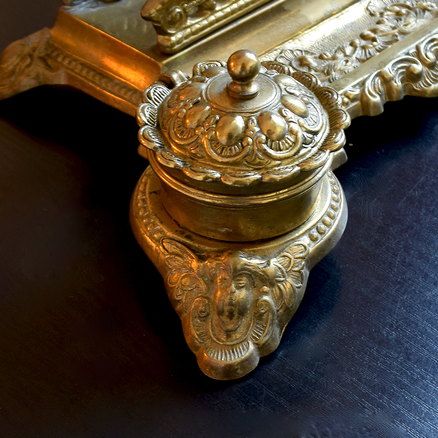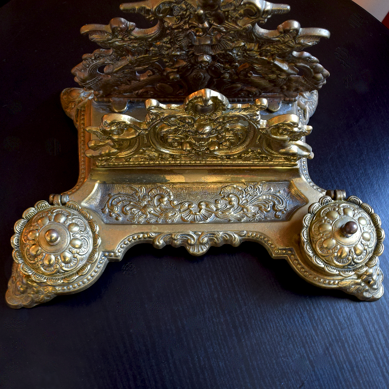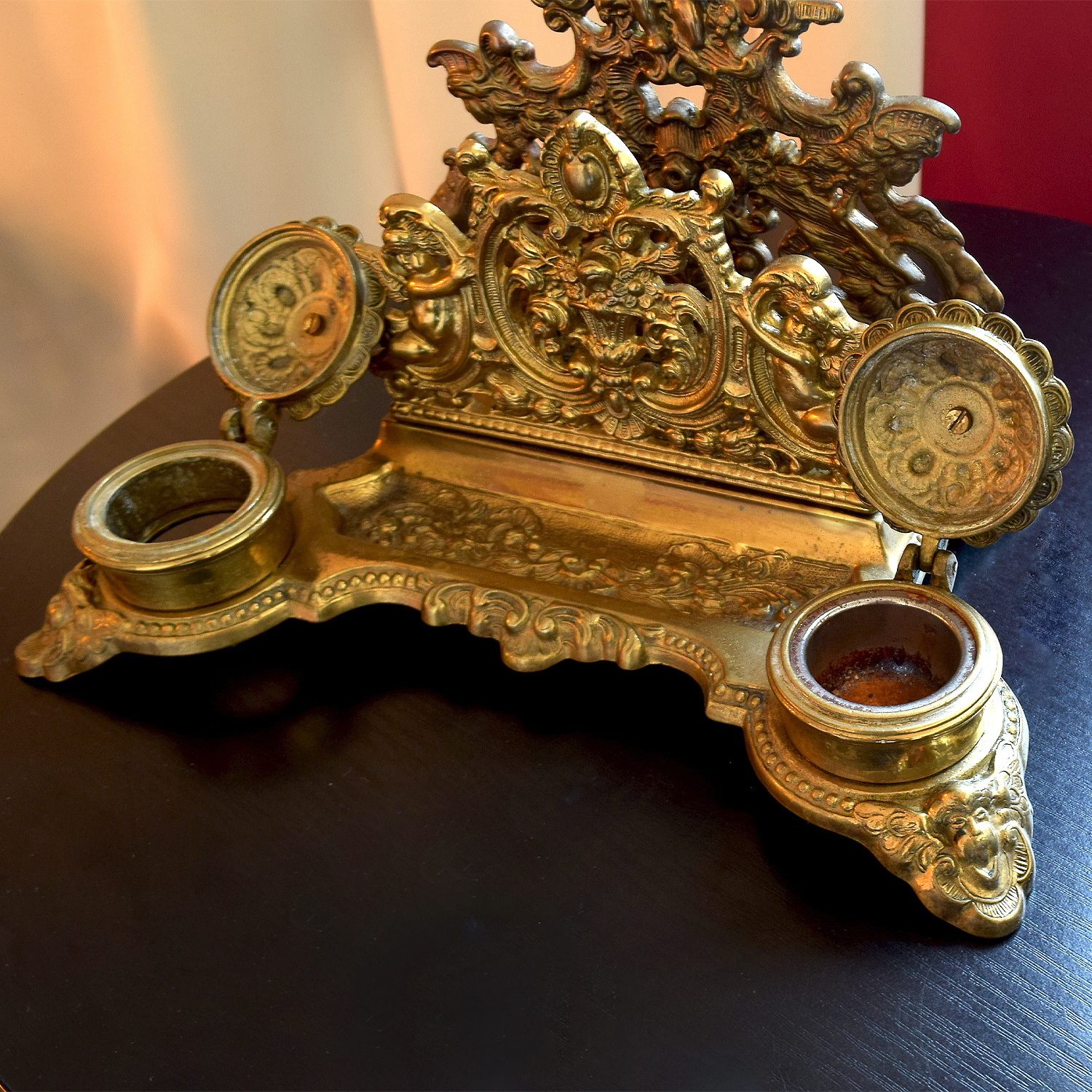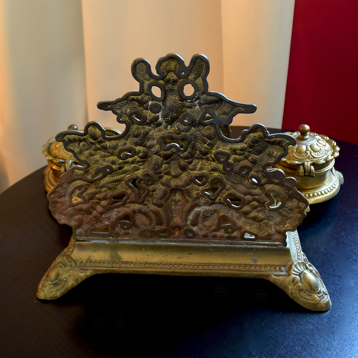 Vintage koperen posthouder, brievenhouder met engeltjes en dubbele inktpot, bureauopberger, bureaudecor